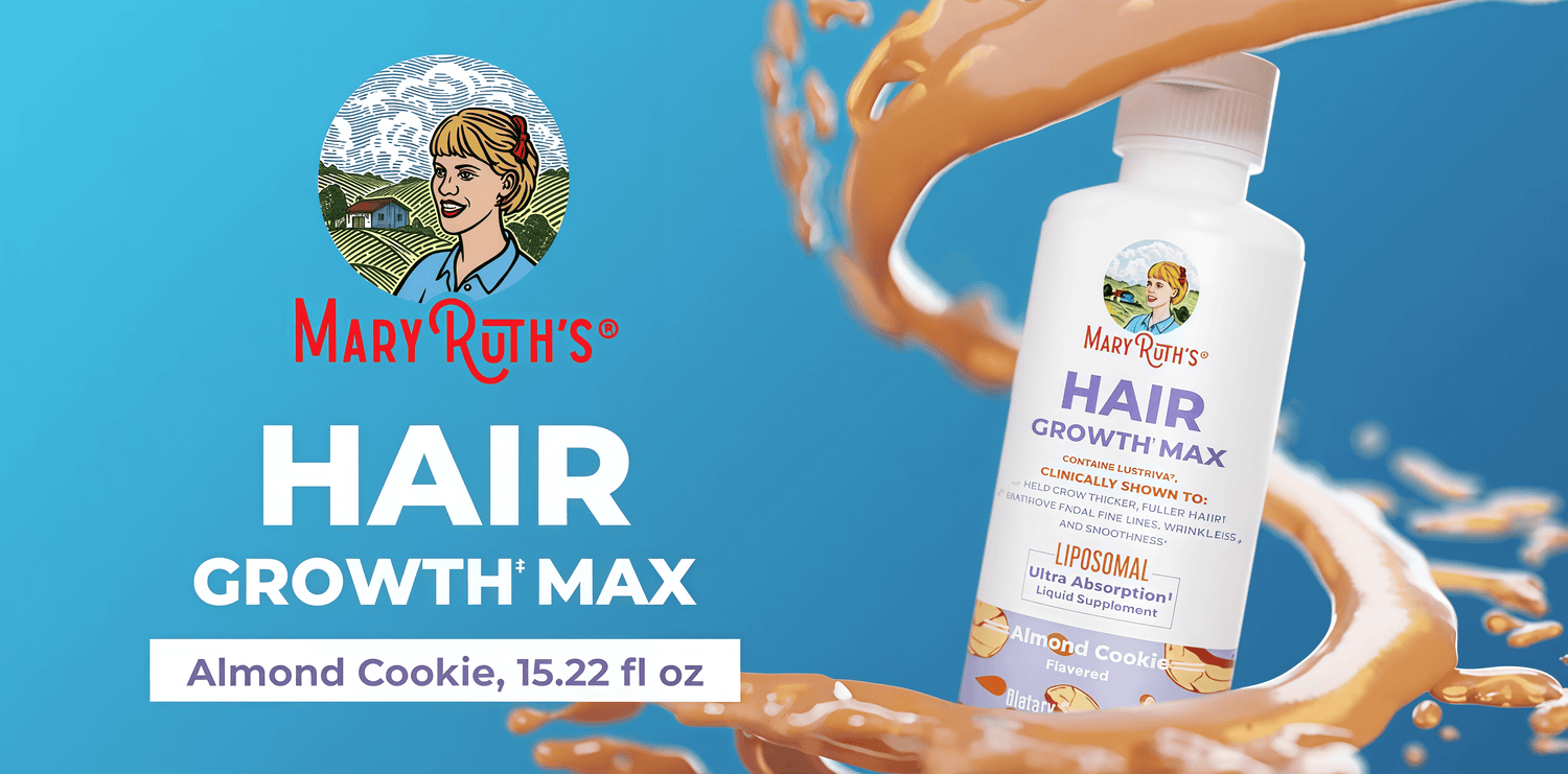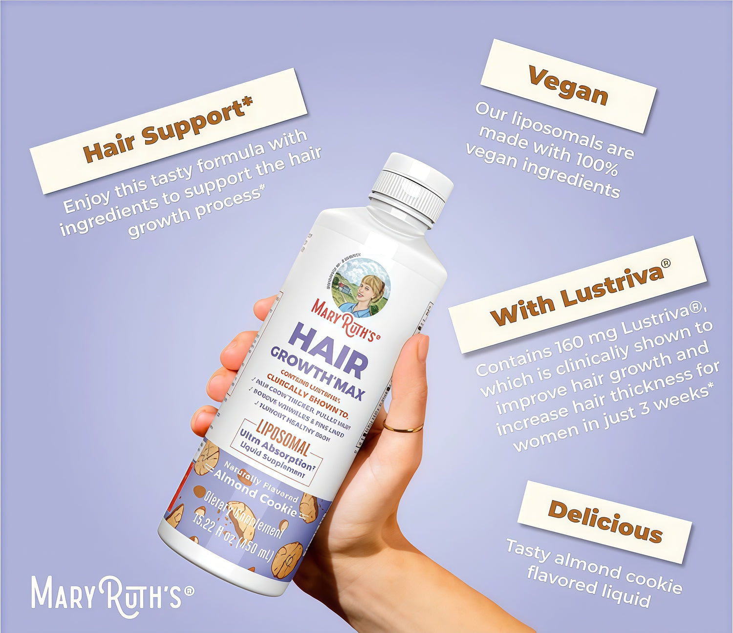- Hair Growth Max Liposomal: Unlike other hair growth products on the market, this ultra-absorbed liposomal contains Lustriva to support your hair and skin from the inside out! You can enjoy the tasty almond cookie flavor on its own or drizzled on a variety of foods.